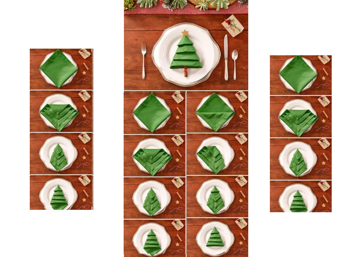 Dobla servilletas de tela de color verde de forma que con la doblez consigas la forma de un arbolito de Navidad.