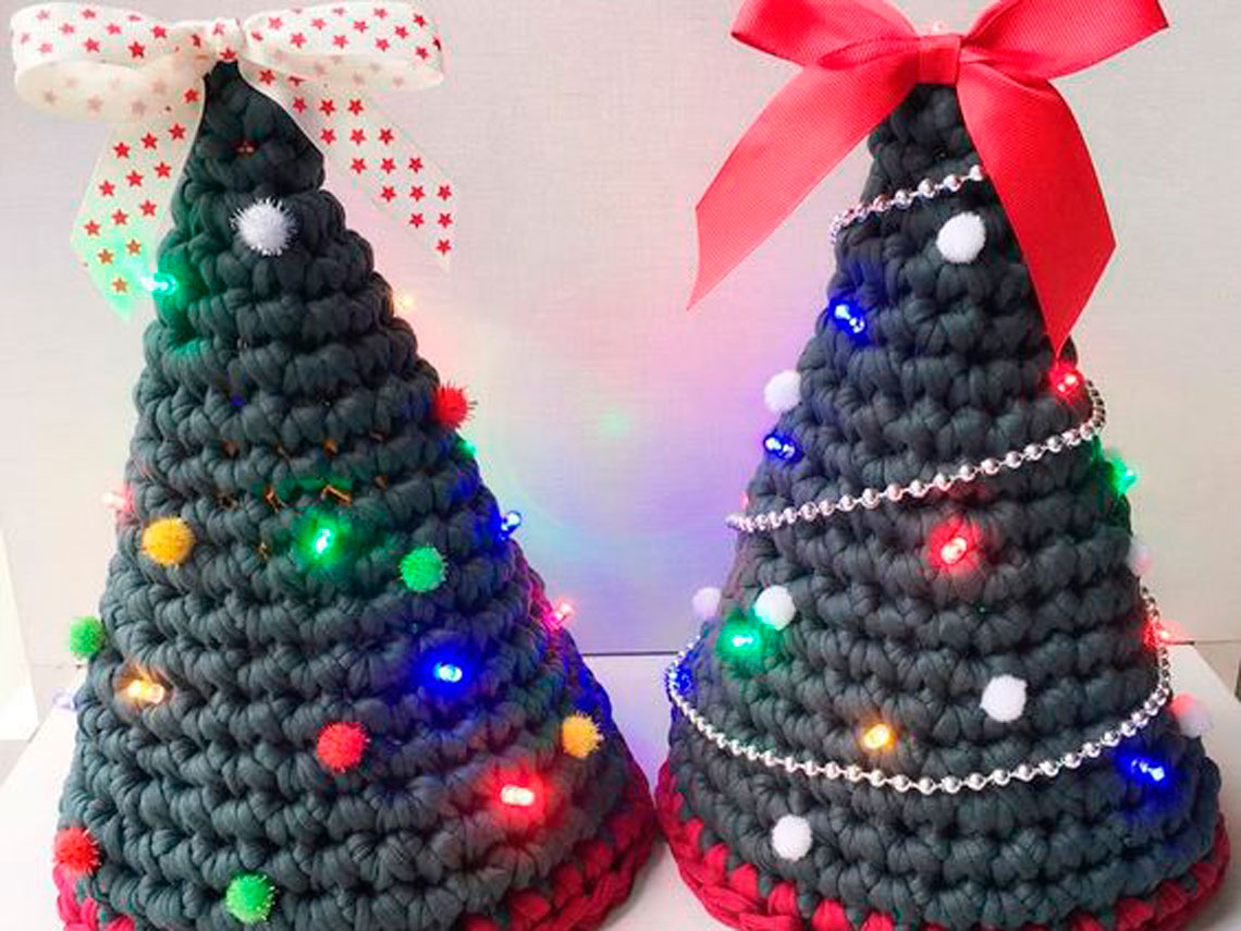 Teje a ganchillo con lana verde y roja un arbolito de navidad y decóralo con luces. ¡Reutilizable y original!
