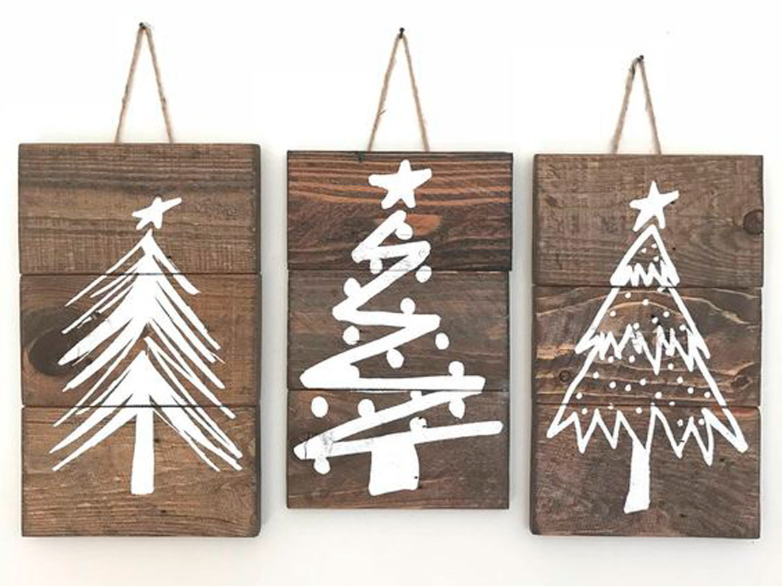 Une varios paneles de madera, pégalos y pinta sobre ellos árboles de Navidad de pintura blanca.