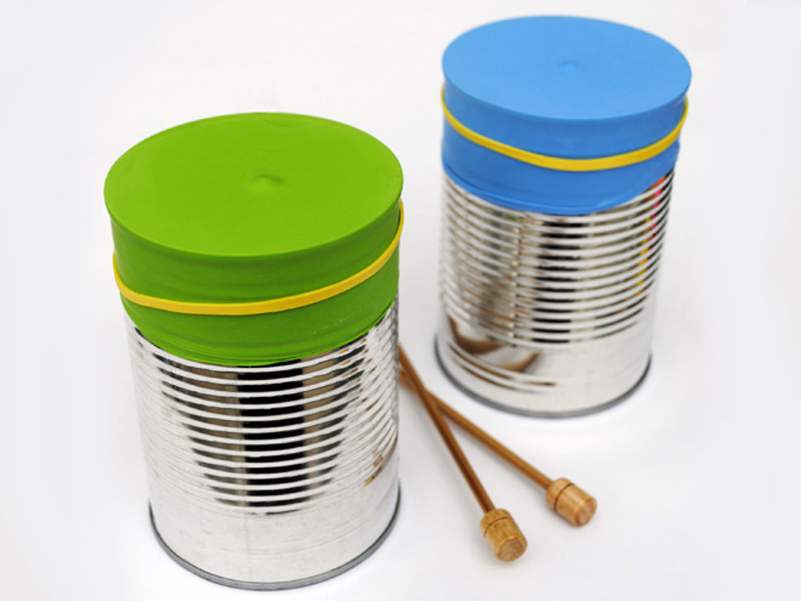 Necesitarás latas de refresco o envases de yogures, globos, gomas elásticas y arroz o lentejas. Simplemente tendréis que llenar los recipientes con el arroz o las lentejas y cubrirlos con globos asegurándolos con gomas. Podéis decorarlos con trozos de globos de distintos colores.Si añadimos unas baquetas también pueden servir como tambores.