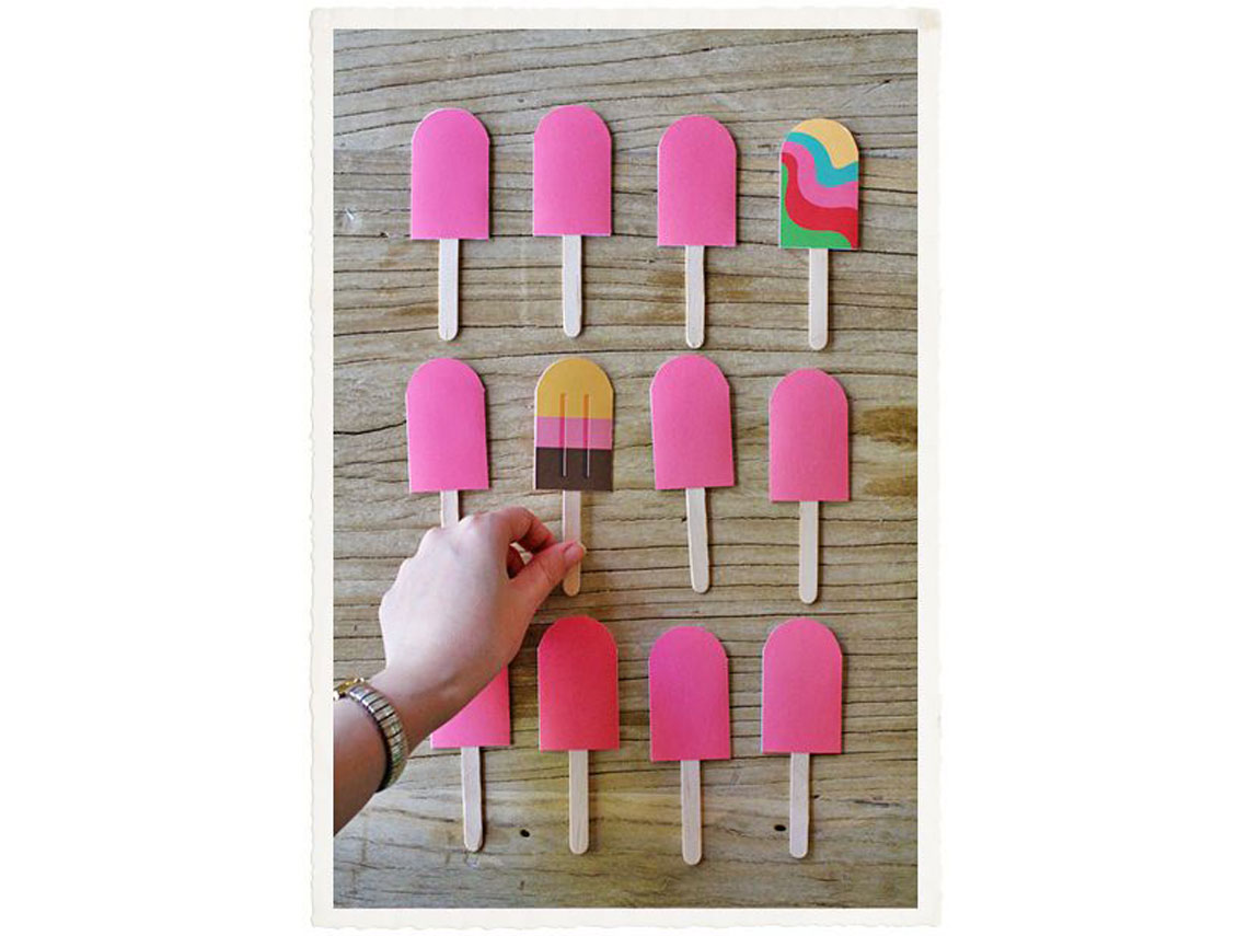 El mítico juego de memoria en versión polos de helado caseros. Solo necesitamos cartulinas de colores, palitos de madera, pegamento y tijeras. Crearemos parejas de helados con el mismo diseño por una cara con el objetivo de que los niños traten de encontrar las parejas con los helados del revés.