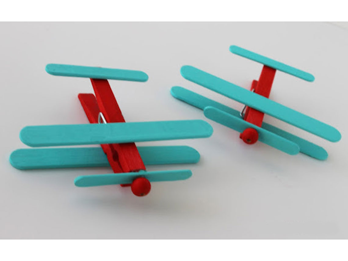 Solo necesitamos pinzas de madera, palitos de helado, témperas, bolitas de madera y cola. Simplemente hay que pegar las piezas de madera con la cola formando el avión como se ve en la imagen y después decorarlo con las pinturas para crear su diseño.