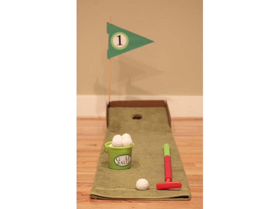 Necesitamos una caja de cartón, una toalla, un vaso de plástico y cinta adhesiva. Se trata de crear el hoyo pegando el vaso en la caja y hacer un camino con la toalla. También podemos incluir una banderilla con cartulina para que sea más realista.