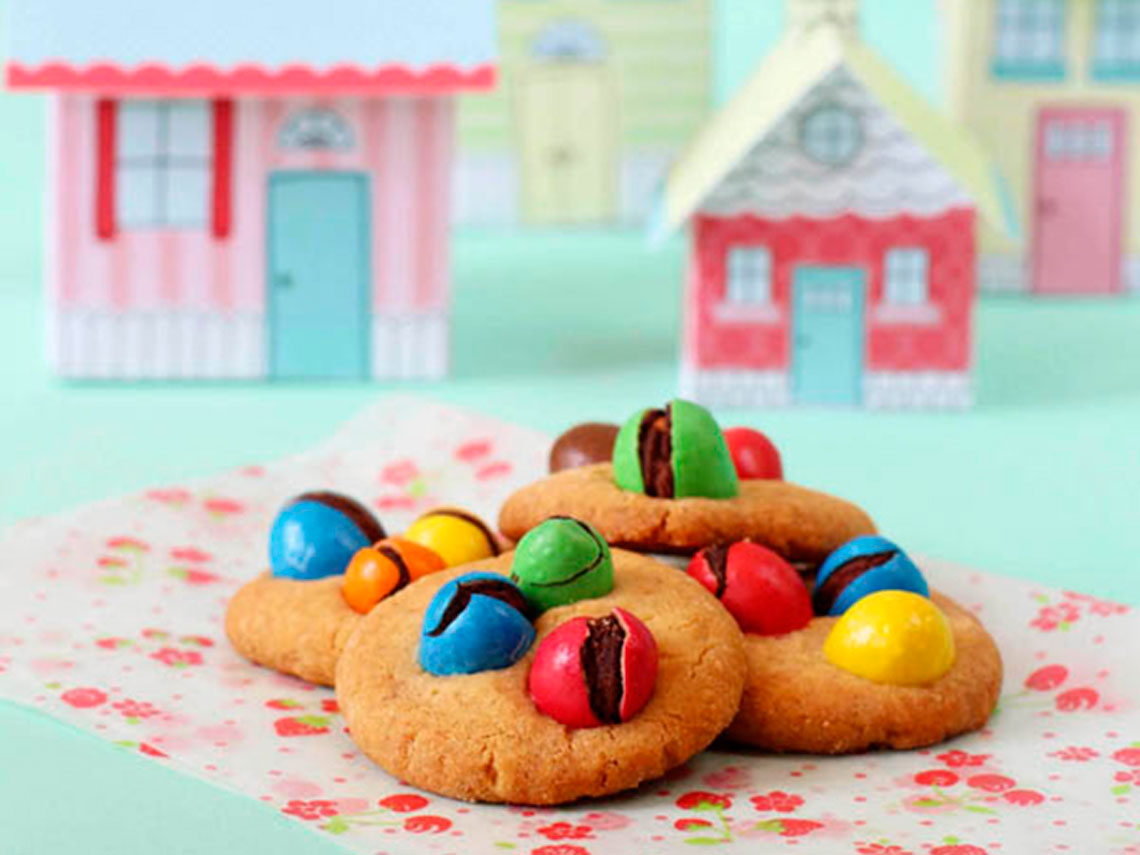Necesitamos: 200 g de harina, una pizca de sal, 5 g de azúcar avanillado (o esencia de vainilla), 75 g de azúcar moreno, 125 g de mantequilla o margarina a temperatura ambiente y un puñado de bolas de colores de chocolate (como Lacasitos o M&M’s).