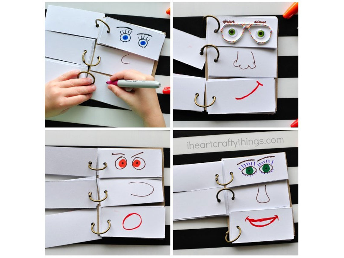 Esta idea es excelente para la educación emocional de los peques. Es muy importante que desde pequeños aprendan a saber reconocer y expresar sus sentimientos y emociones. Y para eso, una buena forma de que empiecen a entender los distintos estados de ánimo puede ser fabricar un libro en el que identificar muchos de ellos. Además de entretenerse mientras lo crean, pasarán un rato divertido con las caras que irán formando.