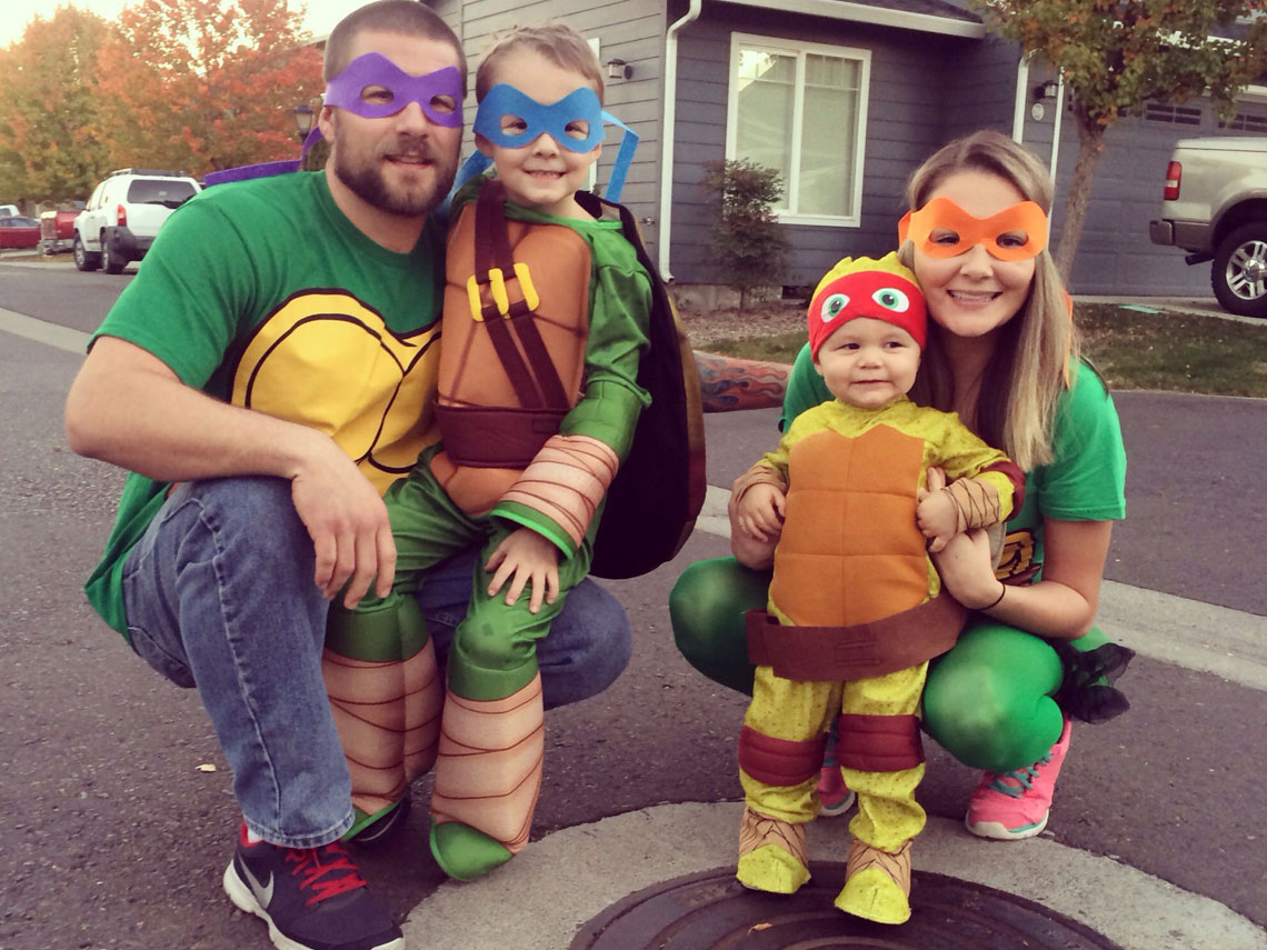 Leonardo, Donatello, Michelangelo, Raphael, ¿cuál es vuestro favorito? Es un disfraz genial, por ejemplo, para todos los primos pequeños. Cada uno es una tortuga y ¡listo! Un gran disfraz en familia.
