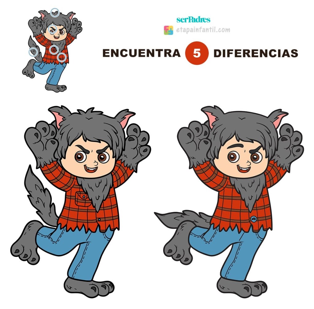 Descarga aquí el juego "Encuentra las 5 diferencias: Pequeño hombre lobo" para imprimir.