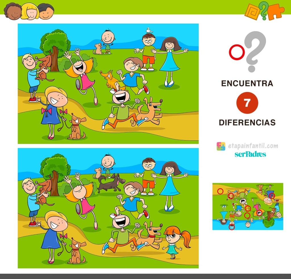 Estos dos dibujos parecen una copia fiel, da la sensación de que se trata de los mismos personajes y que cada uno ejecuta la misma acción, pero no es así. Hay 7 diferencias evidentes entre ambas imágenes que los más pequeños de casa deben encontrar. Sin duda, se trata de un reto que pondrá a prueba su concentración y agudeza visual.