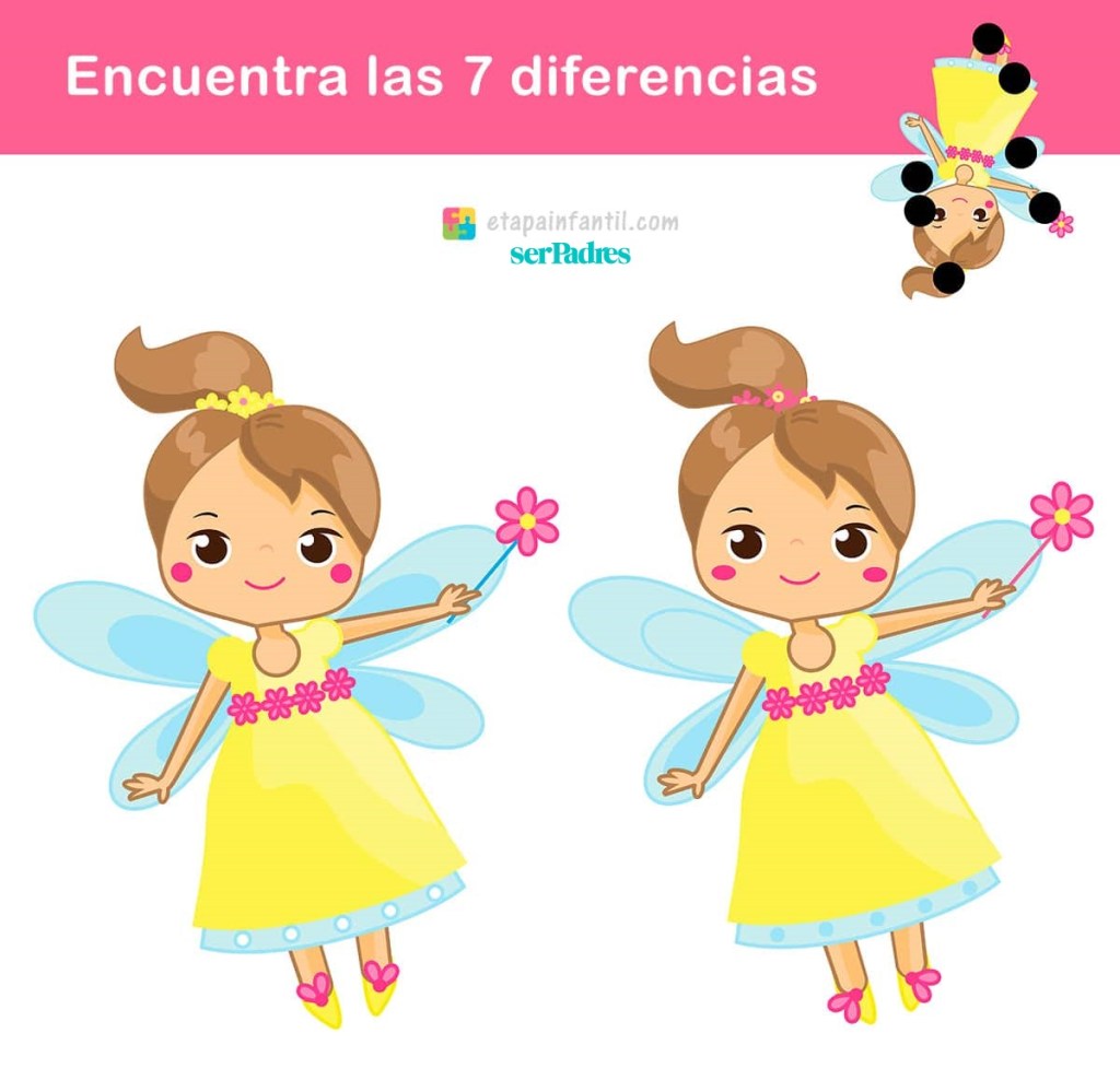 A primera vista, estas dos hadas con varita mágica son idénticas, pero existen 7 detalles que las diferencian. Se trata de pinceladas muy sutiles de las que solo podrán percatarse los niños que reparen con mucho cuidado en ambos dibujos una y otra vez. Una misión perfecta para los pequeños detectives de casa a quienes seguramente no se les pasará nada por alto.