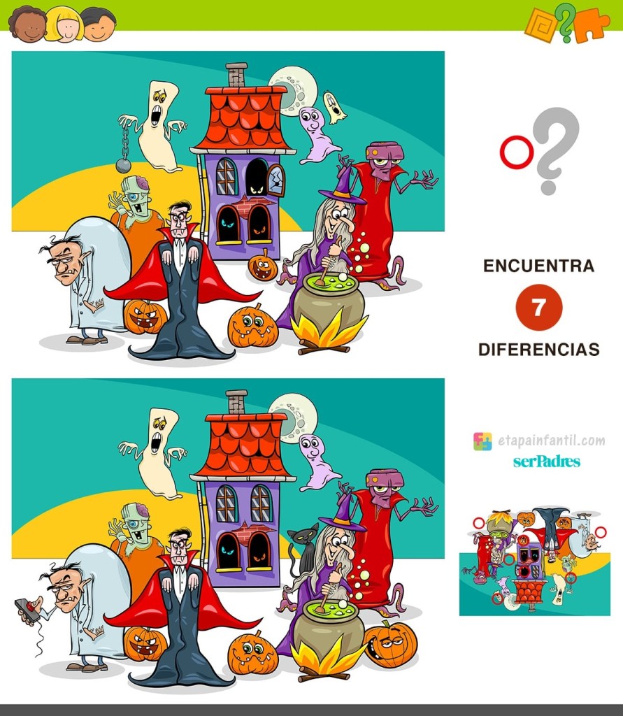 Descarga aquí el juego "Encuentra las 5 diferencias: Personajes de Halloween" para imprimir.