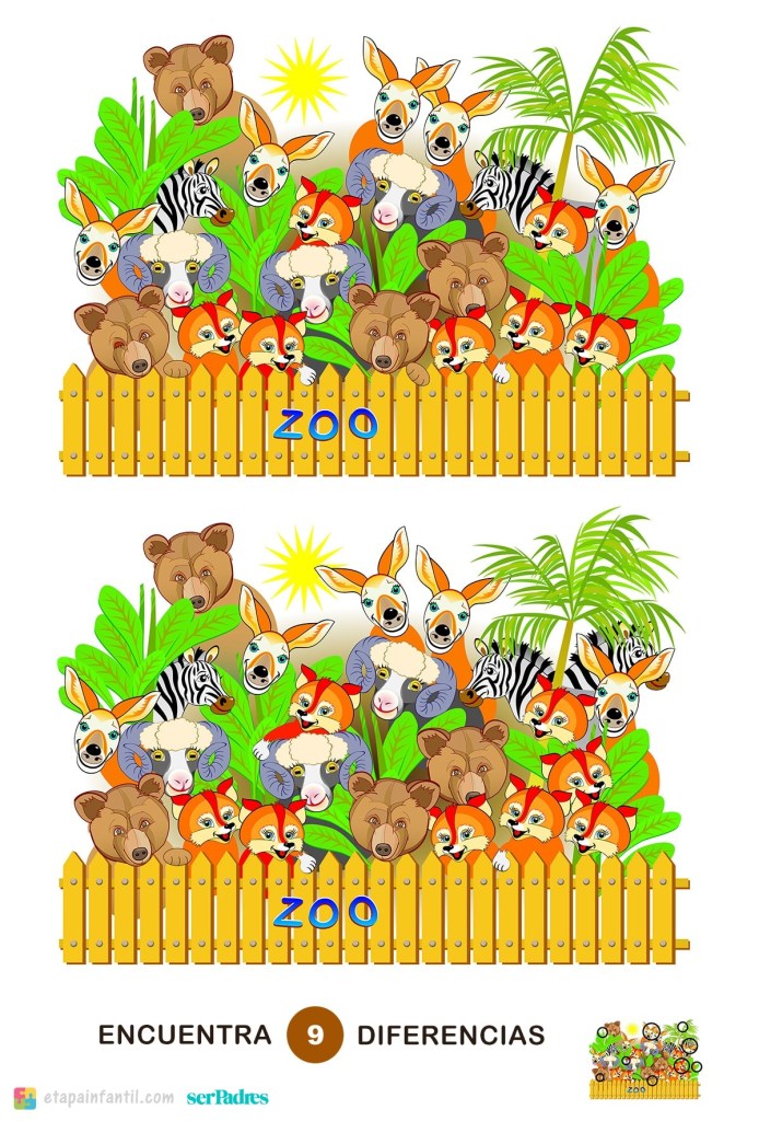 Descarga aquí el juego "Encuentra las 5 diferencias: Animales del zoo" para imprimir.