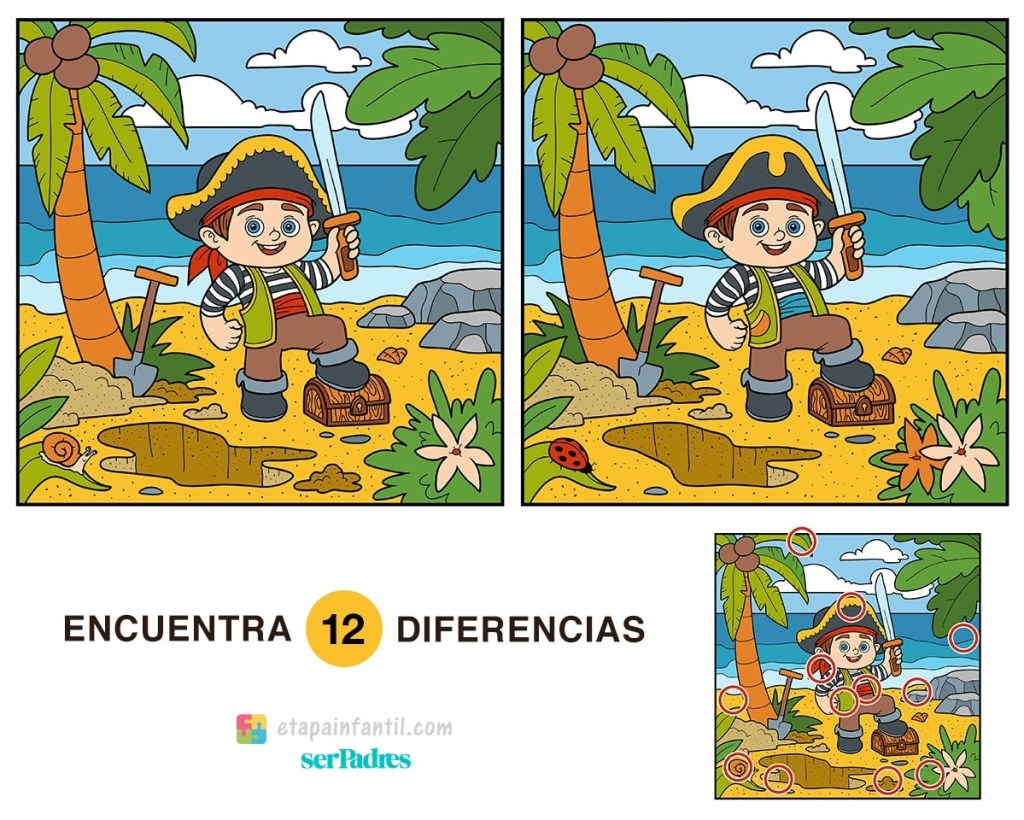 Los niños a los que les apasionan las historias de piratas y corsarios, se divertirán muchísimo encontrando las diferencias entre este par de imágenes de un pequeño pirata con tesoro. Eso sí, tendrán que prestar mucha atención y poner su mayor empeño ya que hay 12 detalles disimiles por descubrir. ¿Una pista? El protagonista del dibujo ha decidido hacer unos pequeños cambios en el vestuario para cada imagen.