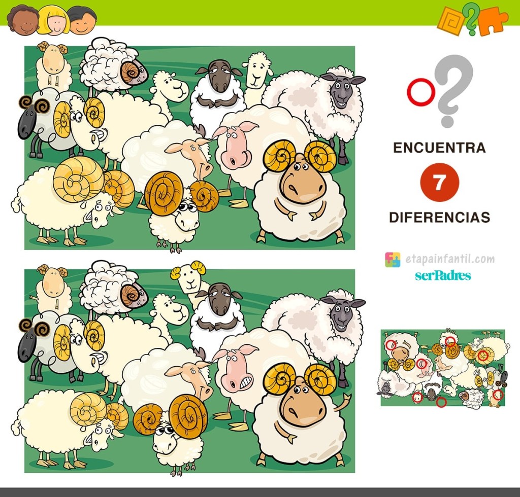 A ojo de buen cubero, estos grupos de ovejas parecen casi idénticos, pero si los niños se fijan bien encontrarán 7 diferencias entre ambos dibujos. Hay detalles más evidentes, pero hay otras discrepancias a las que tendrán que prestar más atención porque están muy bien escondidas. ¿Podrán conseguir el reto?