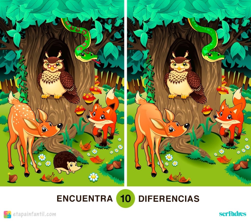 Este par de imágenes de animales en el bosque es perfecto para los peques que quieran entrenar sus habilidades encontrando diferencias. Se trata de dos dibujos muy similares que incluyen 10 detalles desiguales que los niños deben descubrir. Algunos son más evidentes, pero hay otros tan bien escondidos que tardarán un poco en encontrarlos.