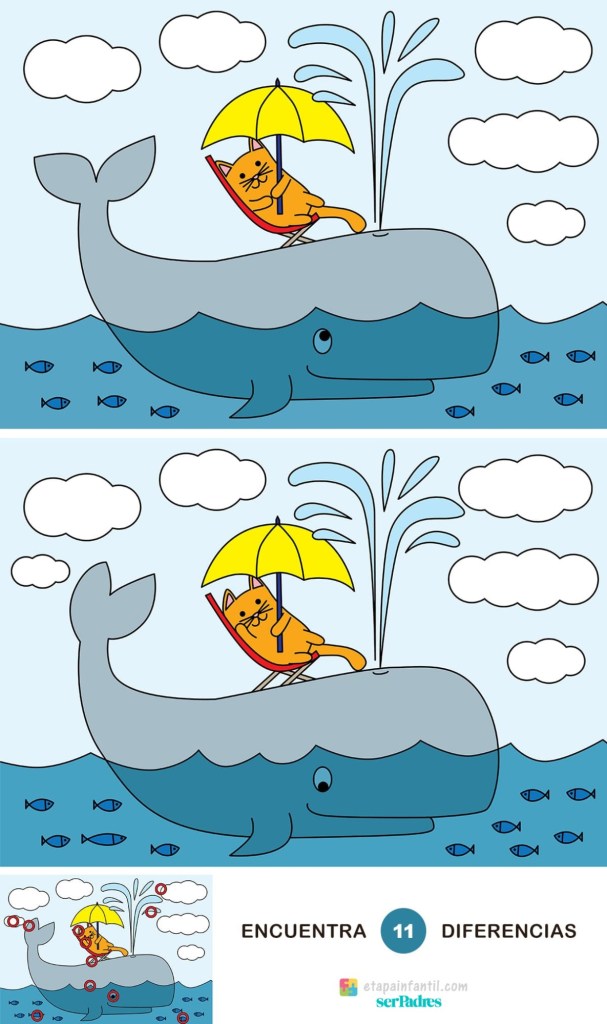 En un primer momento estas graciosas imágenes pueden parecer idénticas, pero si los niños miran con atención descubrirán 11 diferencias entre ambos dibujos. Algunas disparidades son muy claras, pero existen otras más difíciles de detectar. ¿Serán capaces los pequeños de encontrarlas? Una pista: el gatito parece estar más cómodo en una imagen que en la otra.