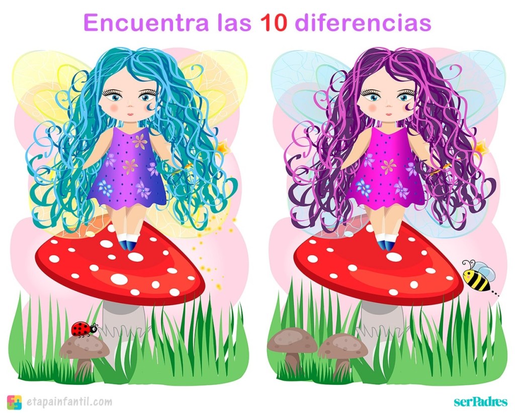 En este par de imágenes se han manipulado las formas y colores para diferenciarlas. En un primer momento puede parecer que es muy fácil encontrar las discrepancias entre las niñas que están sobre una seta, pero hay pequeños detalles que complicarán la tarea. ¿El reto? Encontrar 10 disparidades entre los dibujos no es tarea sencilla, así que los niños no deberían confiarse.
