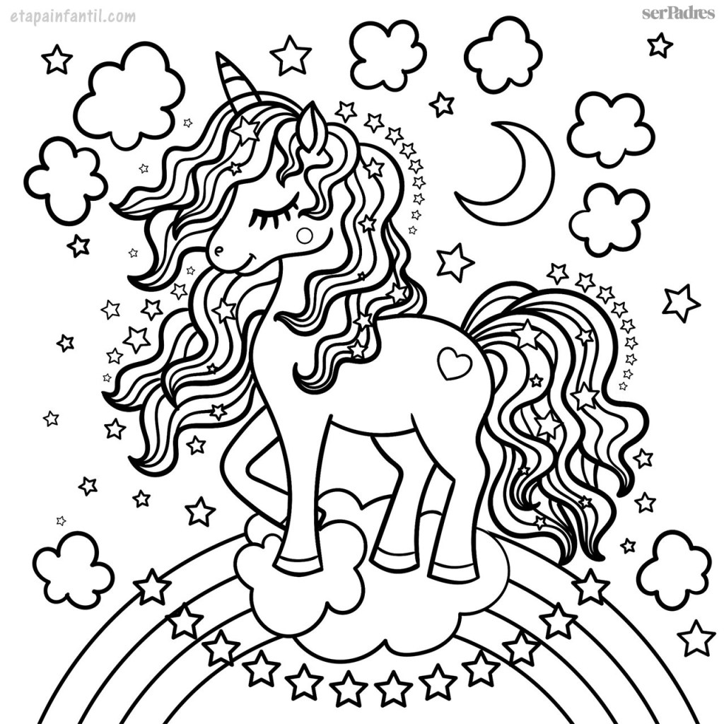 Si buscáis una imagen de unicornio colorear tierna pero sencilla, esta es perfecta. Ideal para los pequeños aficionados a los personajes kawaii, representa a un bebé unicornio sobre una estela de lunas y estrellas con el arcoíris de fondo. Sin duda, un dibujo para colorear que brinda muchas opciones para que los niños puedan combinar sus colores preferidos a su antojo.
