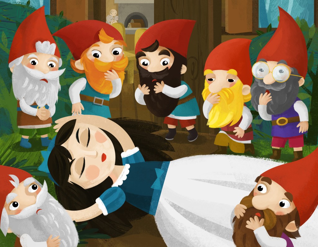 Tras morder la manzana envenenada, Blancanieves cae en un sueño profundo que la hace parecer muerta. Los siete enanitos, desconsolados, construyen una urna de cristal para proteger su cuerpo y velan por ella día y noche. Este estado de letargo simboliza la suspensión entre la vida y la muerte, un momento de espera y esperanza. Los enanitos se niegan a enterrarla, convencidos de que no ha muerto realmente, sino que está bajo un hechizo. Su devoción y amor por Blancanieves reflejan la profundidad de la conexión que han formado con ella.