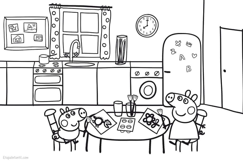 Dibujo de Peppa Pig y George dibujando en la cocina para imprimir y colorear