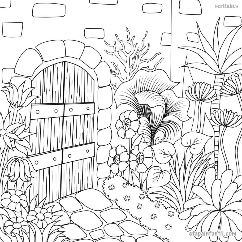 Descarga aquí el dibujo portal y jardín en primavera para imprimir y colorear.