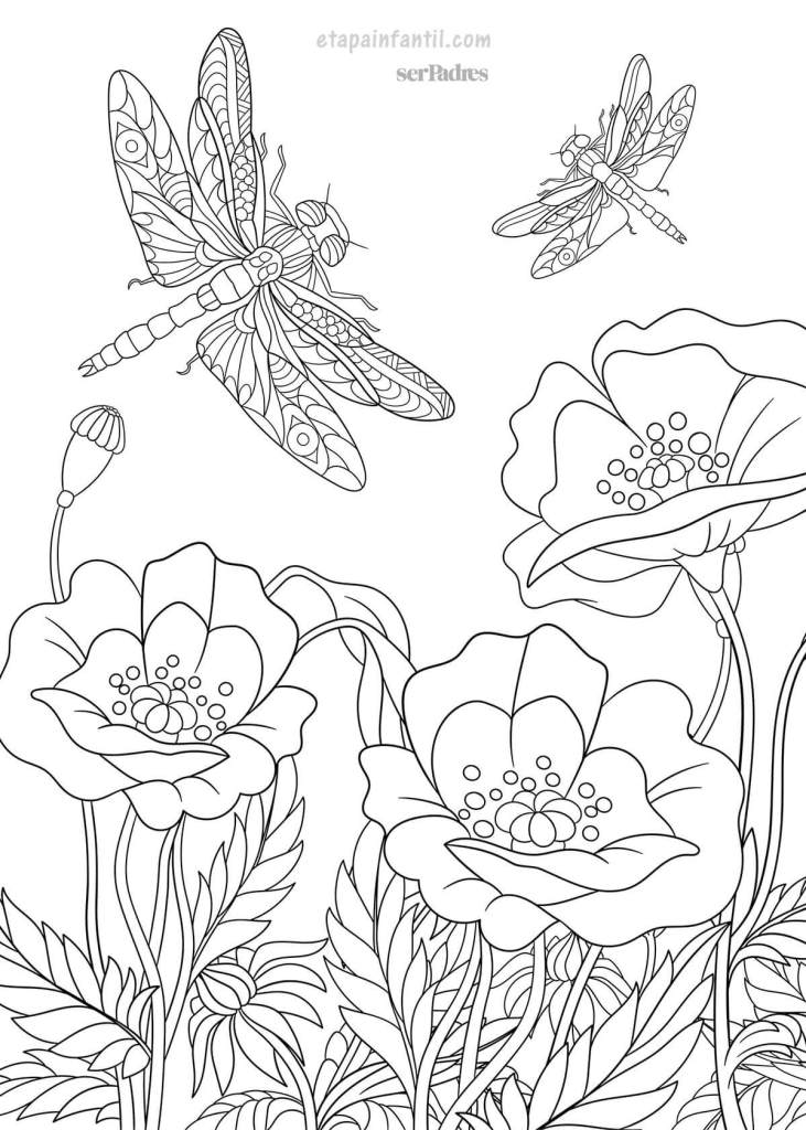 Descarga aquí el dibujo libélulas volando alrededor de flores de amapola para imprimir y colorear.