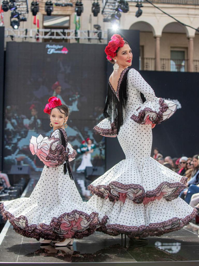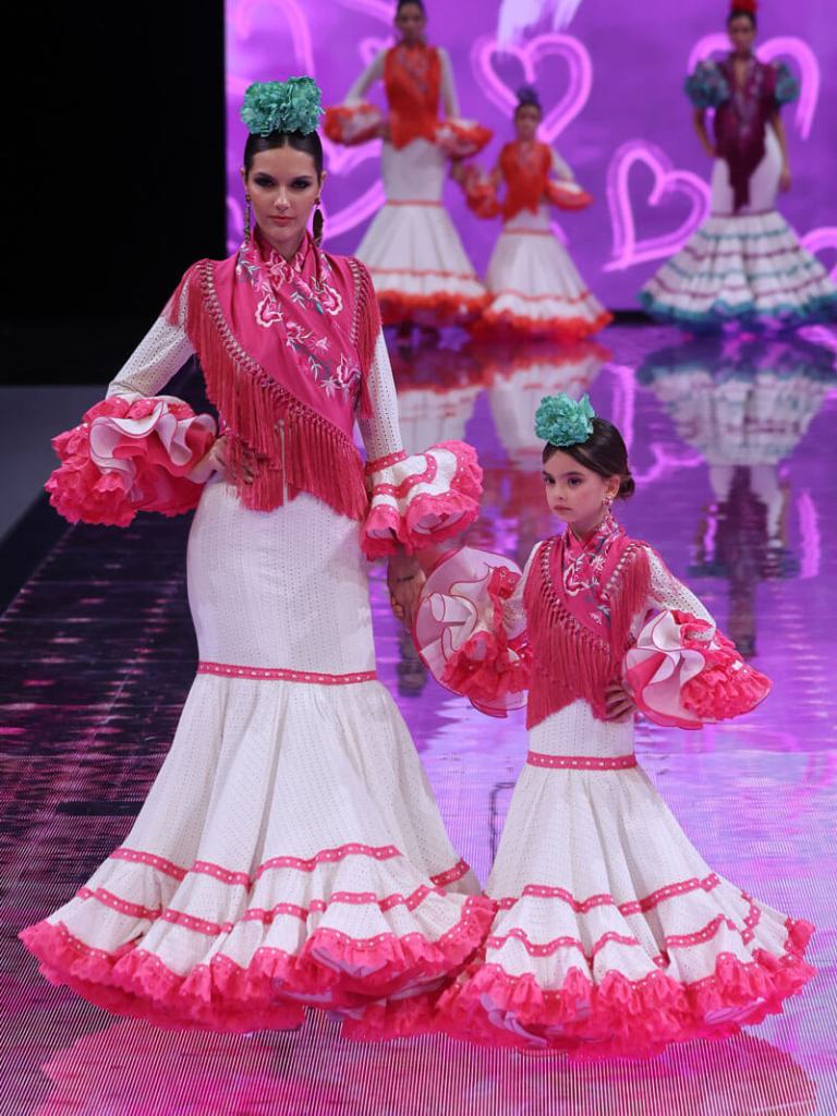 ¿Y si os vestís igual tu hija y tú? “Esta tendencia pisó fuerte en los 2000 y esta temporada flamenca vuelven a llevarse los trajes de flamenca a juego, pero adaptados a cada edad y sin necesidad de que el diseño sea exactamente igual. El mismo tejido, algún estampado o los colores juegan un papel fundamental”