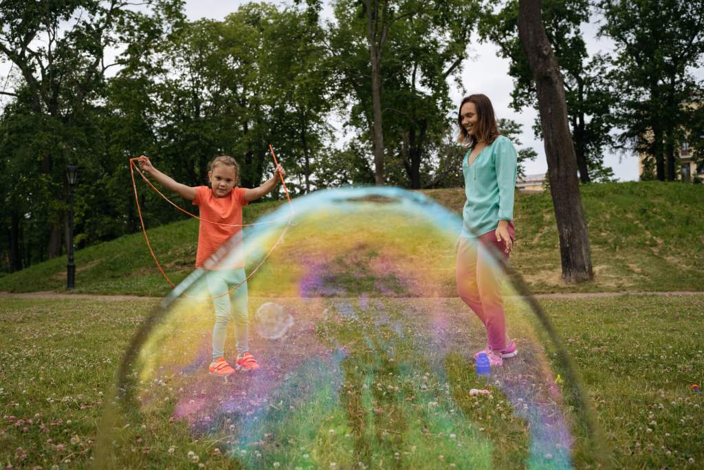 Si tienes un patio o un parque cerca de casa, o si tenéis alguna fiesta de cumpleaños próxima o quedada con amigos, no dudes en hacer el esfuerzo de probar y preparar todo lo necesario algún día de las vacaciones escolares para que tus hijos e hijas puedan hacer pompas gigantes de jabón. ¡Van a alucinar!