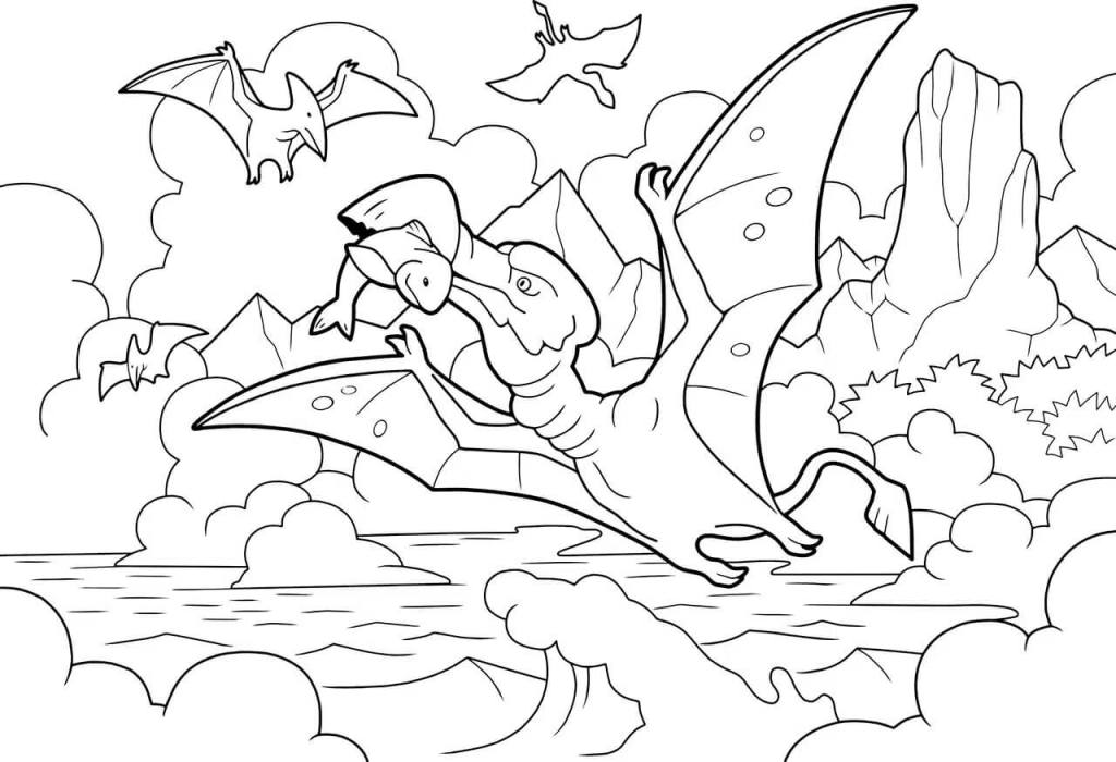 ¿Sabías que algunos dinosaurios también tenían alas y se alimentaban pescando como hacen hoy día las gaviotas? Con este dibujo podrás enseñarles esta curiosidad a los niños mientras ellos se entretienen dándole color a los dinosaurios que aparecen en la imagen. Sin duda, se trata de un dibujo muy chulo con el que los peques podrán hacerse una idea más clara de cómo era la vida en la prehistoria.
