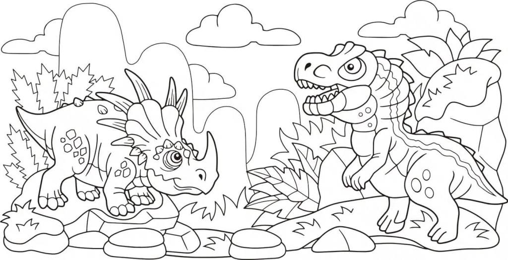 Uno de los motivos que se cree influyó en la extinción de los dinosaurios fue la intensa rivalidad que existía entre las diferentes especies. Y este dibujo es el más fiel ejemplo de dichos problemas. La imagen representa a dos especies diferentes de dinosaurios preparándose para luchar o, al menos, imponerse a su adversario. Un dibujo lleno de detalles al que los peques adorarán darle color.