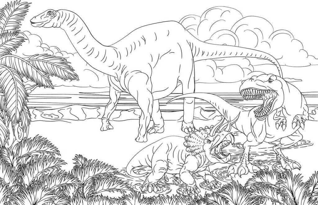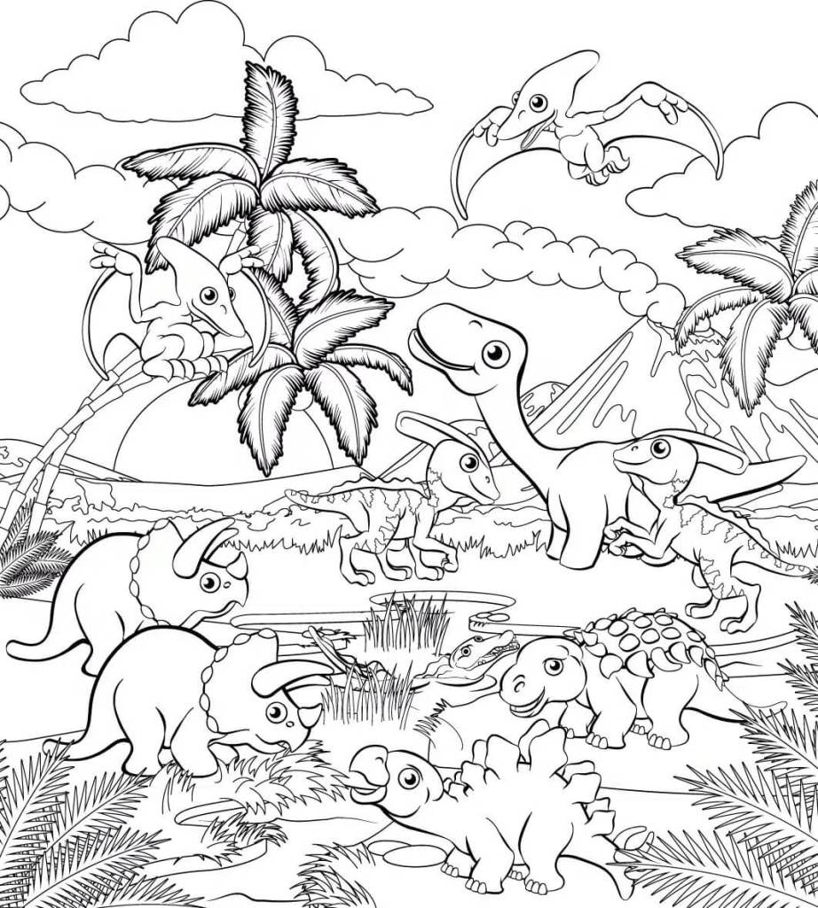 Si buscáis un dibujo chulo con muchos detalles para que los niños puedan echar rienda suelta a su imaginación, esta imagen es perfecta. Representa a diferentes especies de dinosaurios que conviven pacíficamente en torno a un lago. Con un volcán al fondo y muchas palmeras, es ideal para que los niños ejerciten sus habilidades motoras finas mientras dan vida a este escenario prehistórico.