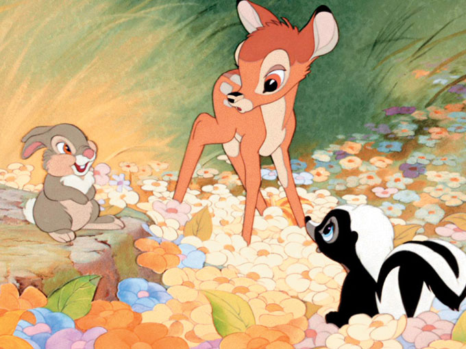 - Bambi. La película es protagonizada por un cervatillo que queda huérfano. Conocida por su hermosa animación y su emotiva historia sobre la naturaleza y la amistad.