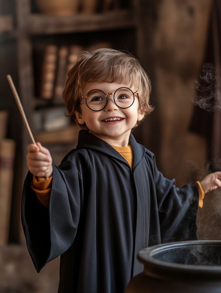 El disfraz de Harry Potter es una opción mágica y encantadora para los pequeños fanáticos de la saga. Para crear este disfraz, comienza con una capa negra que puedes hacer en casa con una sábana o tela vieja, asegurándote de que sea lo suficientemente larga para que flote con estilo. Complementa el look con unas gafas redondas que imiten las de Harry, las cuales se pueden encontrar en tiendas de disfraces o hacer de forma casera con cartón. No olvides añadir una varita mágica, que puede ser tan simple como un palo decorado con cinta adhesiva o pintura. ¡Con estos sencillos elementos, tu pequeño estará listo para asistir a Hogwarts y vivir aventuras mágicas!