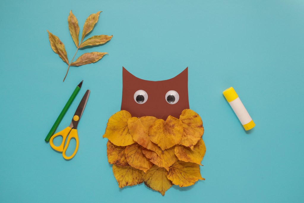 El búho es una de las manualidades otoñales más tradicionales y fáciles de hacer con niños. Solo se necesitan varias hojas marrones para dar forma a su silueta sobre una cartulina. Después se añaden dos grandes ojos —pueden ser saltones o recortados en papel—, un pico triangular y unas patas sencillas. El resultado será un simpático búho que parece salido directamente del bosque otoñal.