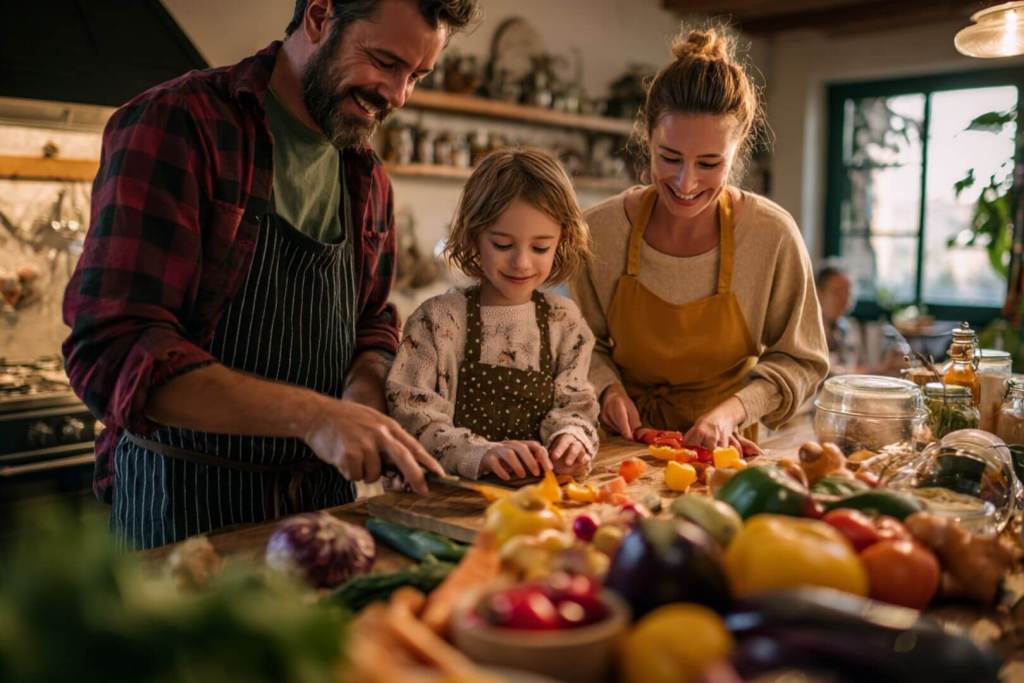 Padres e hijo cocinando juntos en la cocina, cortando verduras frescas sobre una mesa llena de ingredientes saludables.
