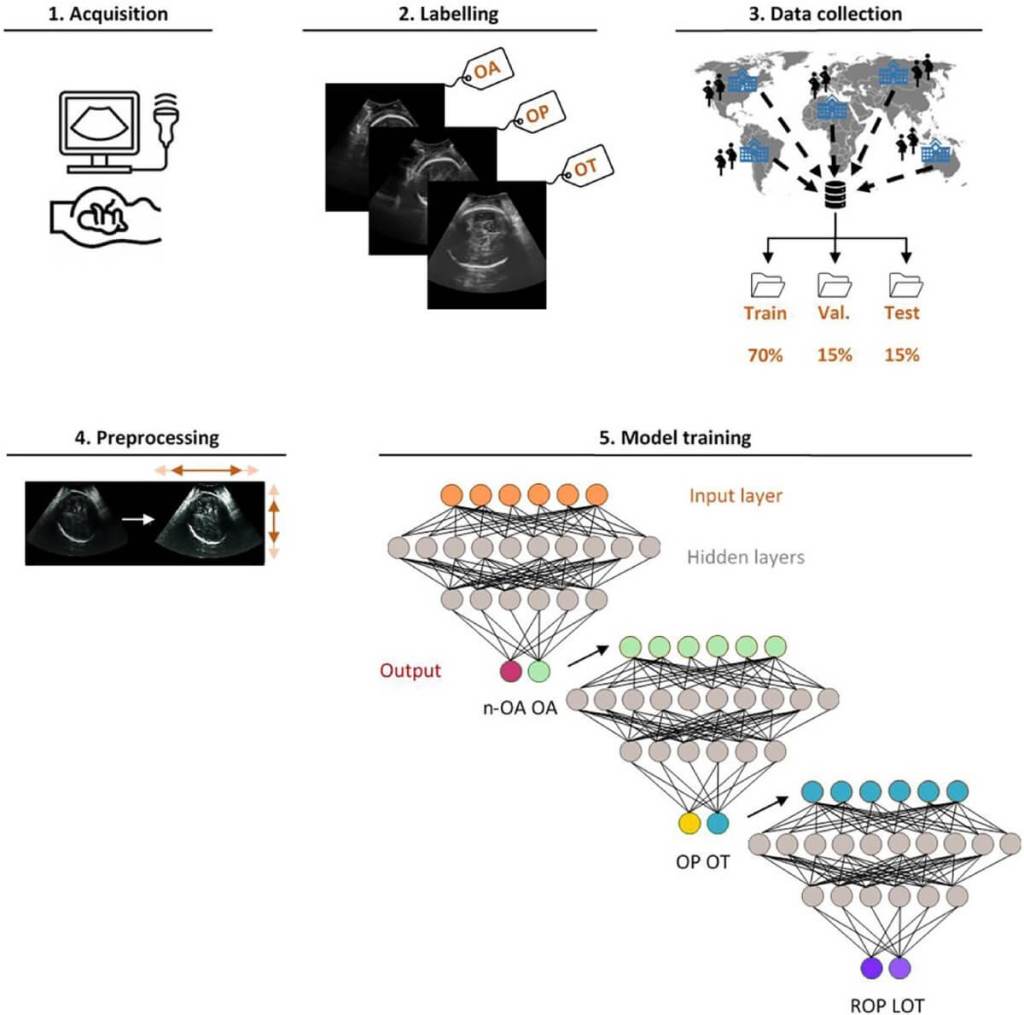 Cada imagen fue etiquetada según la posición del occipucio identificada con ecografía transabdominal (referencia estándar): anterior (OA), posterior (OP), o transversal derecha o izquierda (OT). Posteriormente, se dividieron aleatoriamente en conjuntos de entrenamiento (70%), validación (15%) y prueba (15%), manteniendo una proporción equilibrada entre las diferentes posiciones.