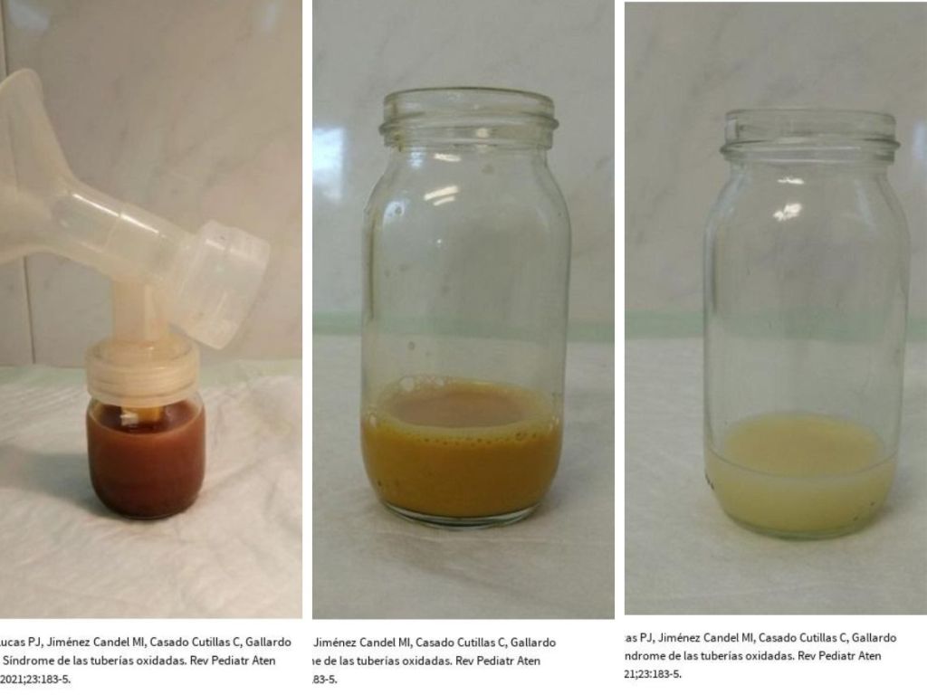 Hace unos años, la revista de Pediatría de Atención Primaria, dependiente de la Asociación Española de Pediatría de Atención Primaria, compartía unas cuantas fotografías de la evolución de una madre primeriza de 34 años a la que se le había diagnosticado el síndrome de las tuberías oxidadas después de acudir asustada a consulta por presenciar leche de color marrón en ambas mamas. “A los tres días la coloración de la leche comenzó a aclararse y a los seis días se volvió totalmente normal, si referirse ningún problema con la alimentación del recién nacido”, argumentaban los profesionales.