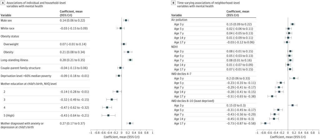 La conclusión más firme del estudio es que vivir en un barrio más acomodado protege la salud mental infantil, y ese efecto se amplifica en la adolescencia. A los 5 años, los niños que viven en zonas más ricas tienen puntuaciones un 0.31 más bajas en dificultades emocionales (lo que indica mejor salud mental) que sus pares en barrios empobrecidos. A los 17 años, la diferencia se agranda hasta −0.73 puntos, según el análisis bayesiano aplicado por los investigadores.