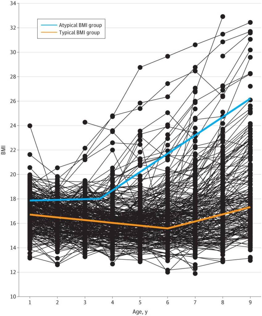 Con esta metodología, encontraron dos trayectorias claras: una típica, presente en el 89% de los niños y niñas, y una atípica, observada en el 11% restante. La trayectoria atípica mostraba un crecimiento del IMC mucho más rápido y precoz.